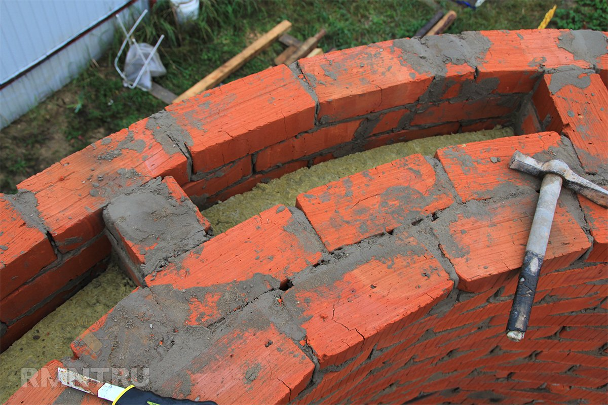 - Между двумя кирпичными «листами» (верстами) остается пустое пространство — «колодец», который заполняется утеплителем (керамзит, пенополистирол, минеральная вата).