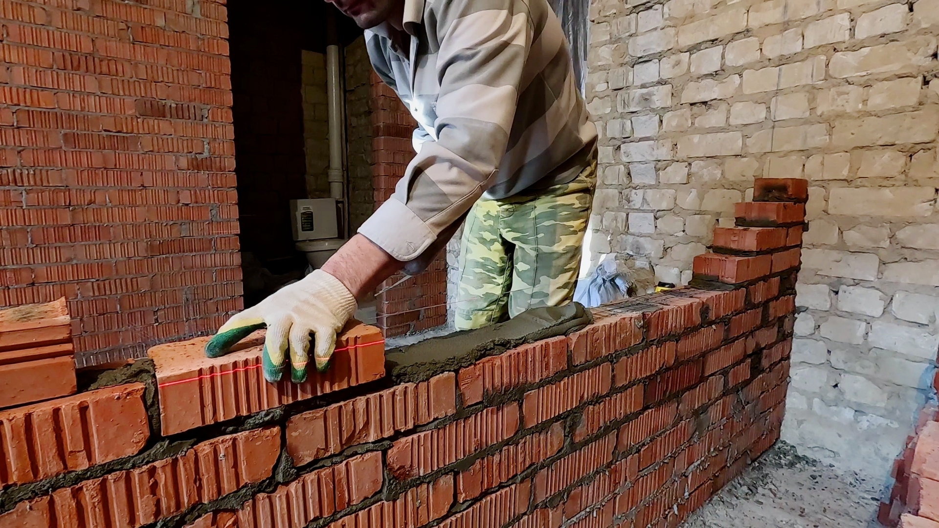 - Вертикаль (отвесность). Проверяется отвесом каждые 2-3 ряда и на каждом углу. Допустимое отклонение — не более 10-15 мм на всю высоту этажа, но лучше стремиться к нулю.