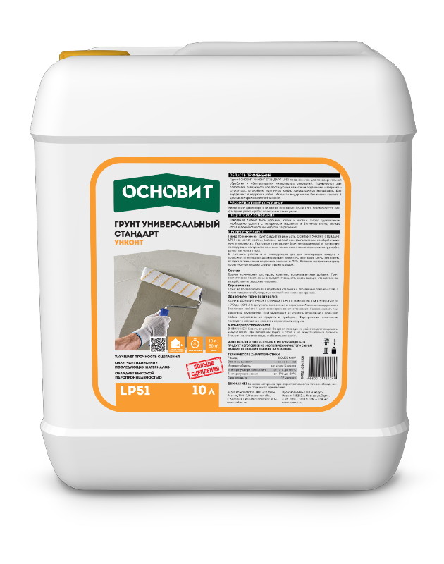 Грунтовка Основит из коллекции Унконт Стандарт имеет вододисперсионную основу и фасуется в тары Канистра 10кг. Состав увеличивает прочность сцепления последующих покрытий с основанием и снижает его впитывающую способность. У грунтовки концентрированный состав и небольшой расход. Она имеет цвет.