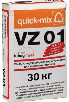 Кладочный раствор VZ серии 01 от Quick-mix предназначен для рядовой кладки стен из кирпича. У состава из летняя серии цементная основа и первоклассные эксплуатационные характеристики: морозостойкость F100, прочность на сжатие >7,5МПа, прочность на сцепление МПа. Раствор выпускается в мешок 30 кг и имеет серый цвет. После затворения состав можно использовать в течение 120 минут, нанося тонким слоем от мм до мм. В этом случае расход смеси составит 40-50 (слой 10 мм) кг/м2.