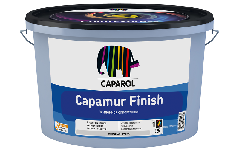 Тонкослойная краска Caparol Capamur Finish предназначена для окрашивания фасадов с гладкой и мелкофактурной поверхностью. Она обладает исключительной адгезией практически на всех основаниях и создает матовое износостойкое покрытие. Оно устойчиво к атмосферным осадкам и агрессивным факторам окружающей среды, легко моется водой или мыльным раствором. Белая краска для фасада Caparol Capamur Finish колеруется в тысячи оттенков ручным или машинным способом в системе ColorExpress.