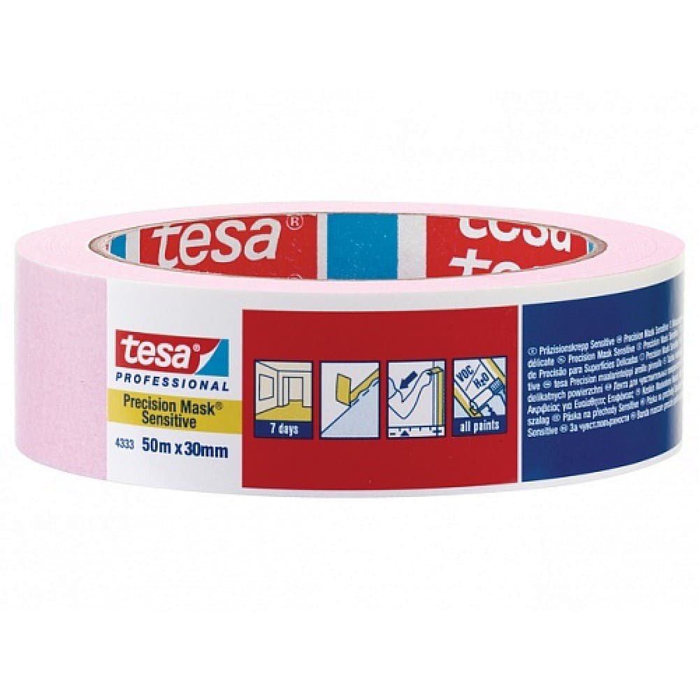 Малярная лента Tesa 04333-00019-02 в цвете розовый, предназначена для создания аккуратных и четких границ при окрашивании вне помещений. Ее ширина 30мм, а длина 50000мм. Благодаря уникальной формуле клея, малярная лента легко удаляется, не оставляя следов. Она выпускается в Германии.